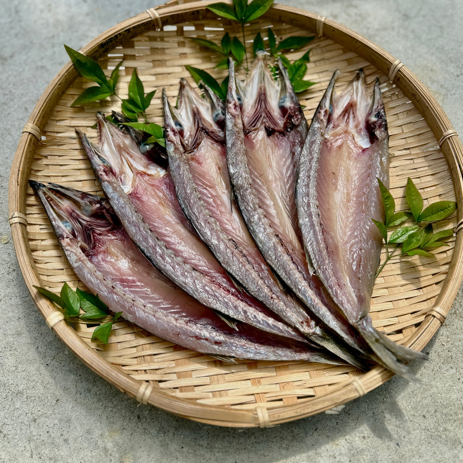 宮崎県・串間市の漁師が、朝に水揚げしたばかりの新鮮なカマスをその日のうちに捌き、天然塩「海の精」だけで丁寧に仕込み、天日と潮風でじっくりと干し上げたこだわりの干物です。